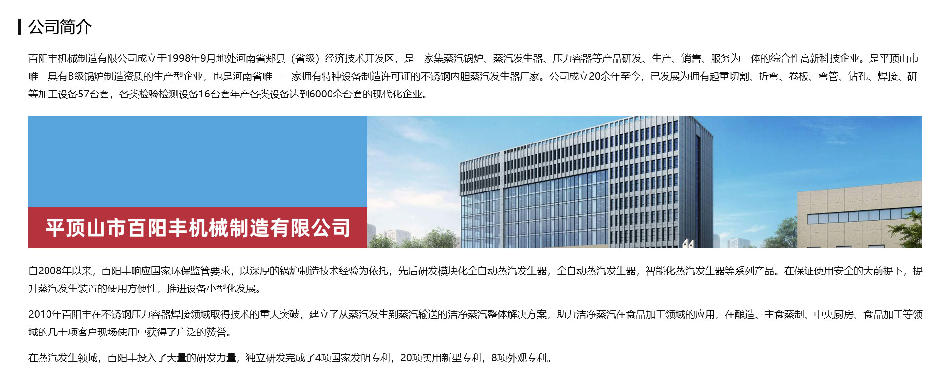 百陽豐機械制造有限公司成立于1998年9月地處河南省郟縣(省級)經(jīng)濟技術(shù)開發(fā)區(qū),是一家集蒸汽鍋爐、蒸汽發(fā)生器、壓力容器等產(chǎn)品研發(fā)、生產(chǎn)、銷售、服務(wù)為一體的綜合性高新科技企業(yè)。是平頂山市一家具有B級鍋爐制造資質(zhì)的生產(chǎn)型企業(yè),也是一家擁有特種設(shè)備制造許可證的不銹鋼內(nèi)膽蒸汽發(fā)生器廠家。公司成立20余年至今,已發(fā)展為擁有起重切割、折彎、卷板、彎管、鉆孔、焊接、研等加工設(shè)備57臺套,各類檢驗檢測設(shè)備16臺套年產(chǎn)各類設(shè)備達到6000余臺套的現(xiàn)代化企業(yè)。